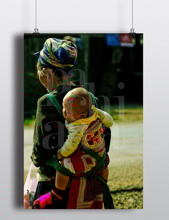 In 2012, I had the pleasure of traveling to Thailand and Laos in mid-December. In Laos, we visited my father's sister's home and village. It had a magically feeling that made us want to stay. With my camera in hand, I explored Phonsavan, Xieng Khouang Province where my aunt lived. Here is a photograph of my grandmother's younger sister and her grandchild wrapped in a Hmong textiles baby carrier. This photograph brings back memories of feeling no worries, relaxing and visiting neighbors to neighbors. My aunt's village was one of the sweet memories I had. I hope this photo gives you that feeling and shows you the love of a grandmother to her grandchild.